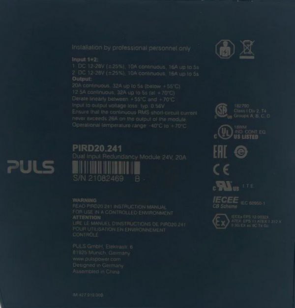 ماژول PULS PIRD20.241 یک ماژول ریداندنسی دو ورودی است که برای ساخت سیستمهای 1+1 و N+1 در کاربردهای صنعتی طراحی شده است. این تجهیز دارای دو ورودی مستقل (هر کدام تا 10 آمپر) و یک خروجی حداکثر 20 آمپر است و برای استفاده همراه با منابع تغذیه با رفتار اضافهبار پیوسته یا بهصورت hiccup مناسب میباشد.